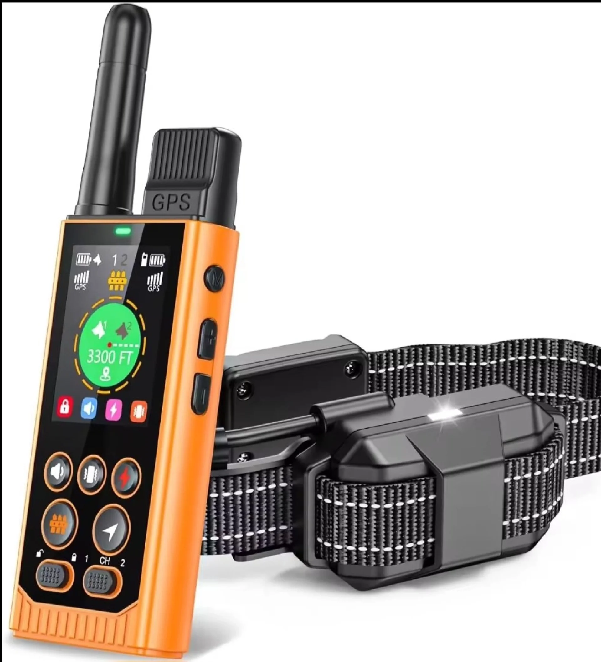 Водоустойчив комплект за дресировка и следене на кучета с каишка и приемник е много подходящо средство, което предоставя едно ново изживяване за ловци и треньори. Моделът може да се използва за проследяване на животното в реално време, както и звуково, вибрационнои електрошоково стимулиране при необходимост. Токова стимулация от 0 до 100 нива.