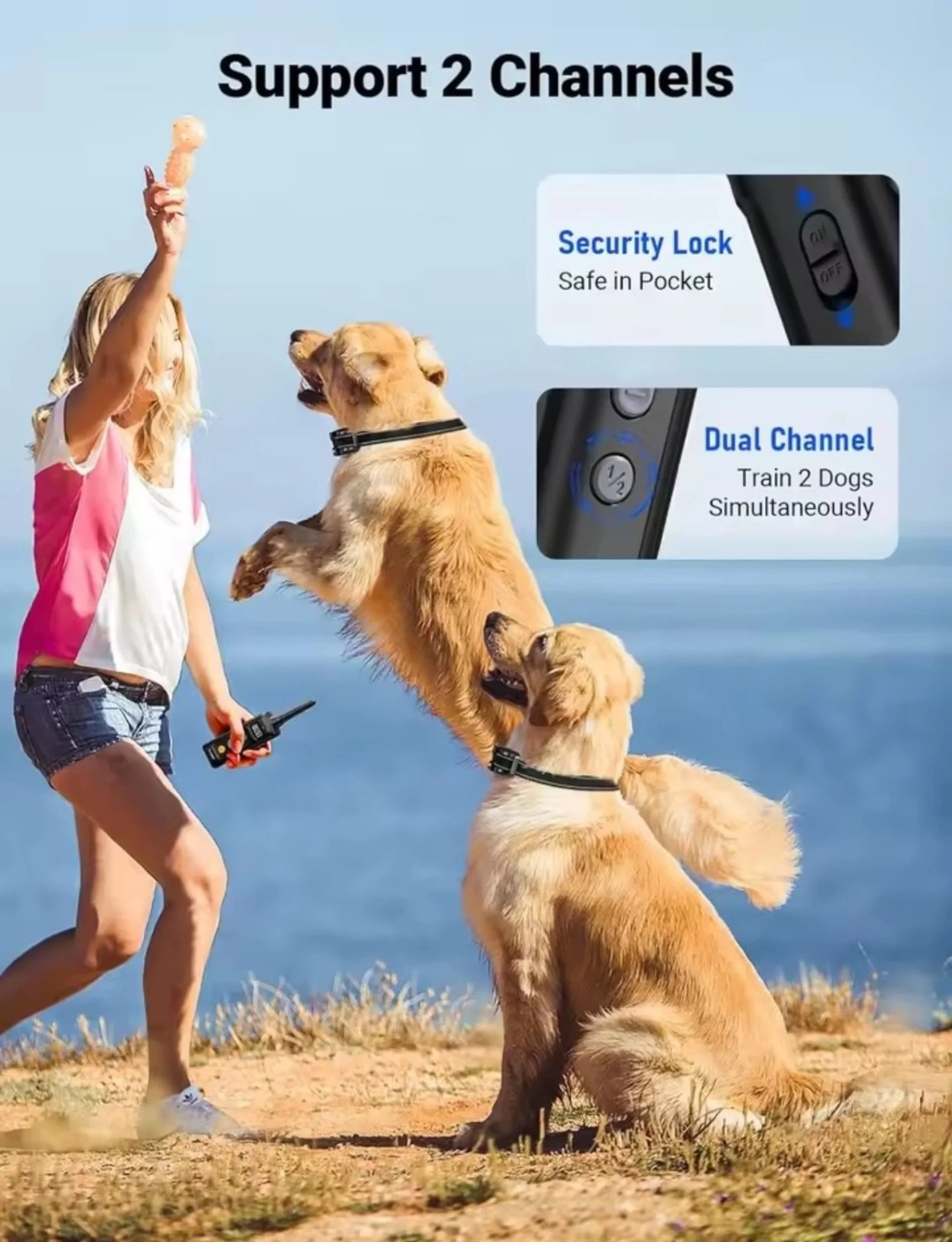 Дистанционното разполага с предпазен бутон за заключване, който елиминира риска от случайно натискане в джоба или по време на движение. Освен това, чрез двойния канал можете да добавите втори нашийник и да обучавате две кучета едновременно.